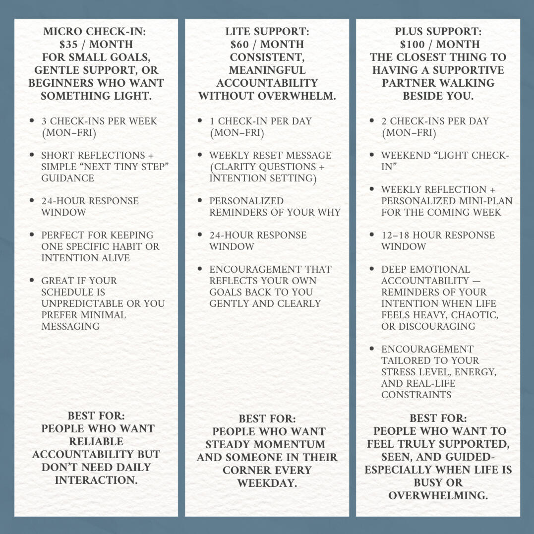 Consistent support through daily or near-daily check-insReflection prompts when life feels overwhelmingGentle accountability rooted in compassionReminders of your purpose, values, and intentionsA steady guide helping you keep your goals in focusClearLight is not:Therapy, crisis counseling, or medical advice24/7 messaging accessHigh-pressure coaching or “tough love”A guarantee of specific resultsSupport hours follow a predictable rhythm. Messages are answered within the timeframe of your selected plan, with lighter availability on weekends. Boundaries keep the support steady, sustainable, and healthy for both sides.
